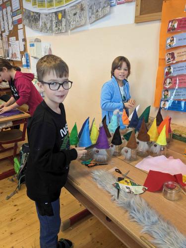 Wir banden unseren Adventkranz selbst und bastelten Weihnachtswichtel, um sie beim Punschstand zu verkaufen.