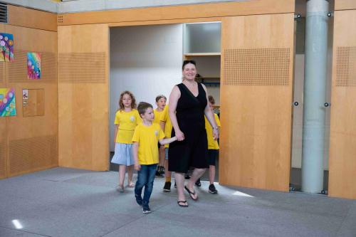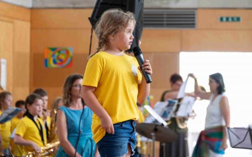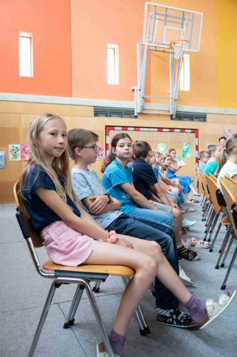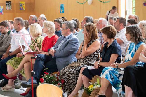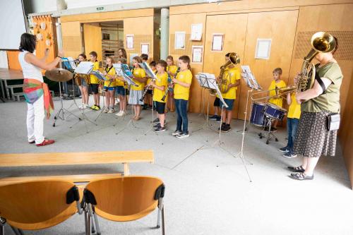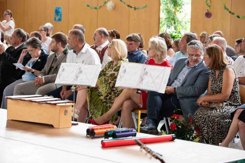 Unsere Bläserklasse eröffnete mit Bravour und viel Lob im Anschluss mit einer Fanfare die Feier. Die Kinder aller drei Schulen (Irnfritz-Messern, Brunn/Wild und Japons) sangen ihre Schullieder auf der großen Bühne. Drei Lieder wurden von allen Kindern gemeinsam gesungen. Die Bürgermeister der drei Gemeinden, die Schulaufsicht, die Elternvertreter, Direktoren aus anderen Schulen und Kollegen gratulierten und überbrachten Geschenke. Das größte Geschenk war aber das der 130 Kinder, von denen jedes ein eigenes Holzstöckchen verziert hatte. Diese wurden dann als Sonnenstrahlen um eine Blume des Lebens angebracht.