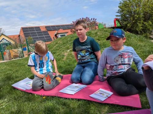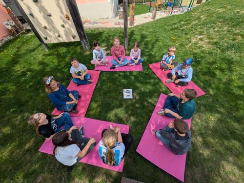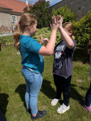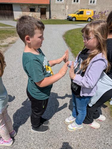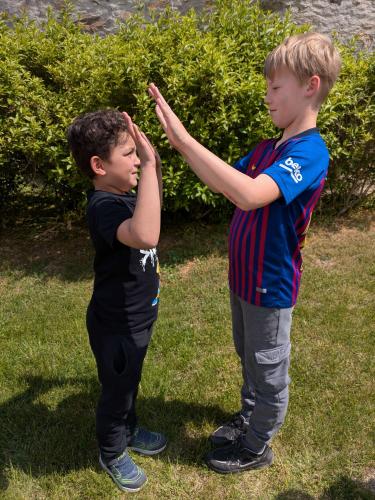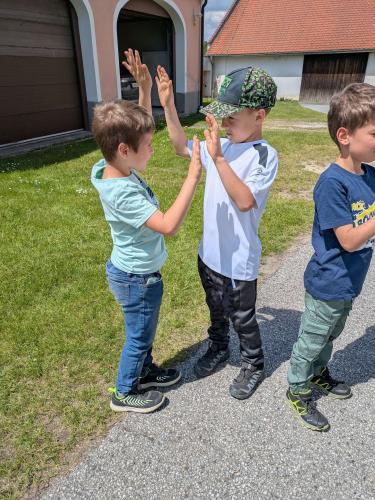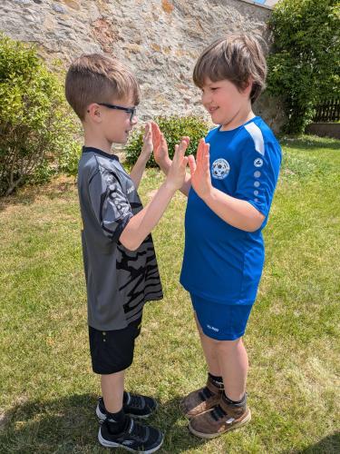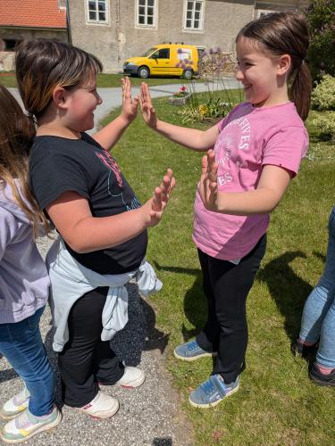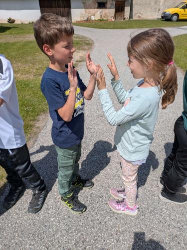 Als beruhigende Übung am Ende einer Turnstunde probierten wir eine Partnerübung aus. Bei der ging es darum sich gegenüberzustehen, sich gegenseitig zu spiegeln und sich dabei ganz tief in die Augen zu sehen. Viele Kinder konnten feststellen, dass es in den Händen zu kribbeln begann, einige berichteten auch, dass es vibrierte – magische Kräfte?!